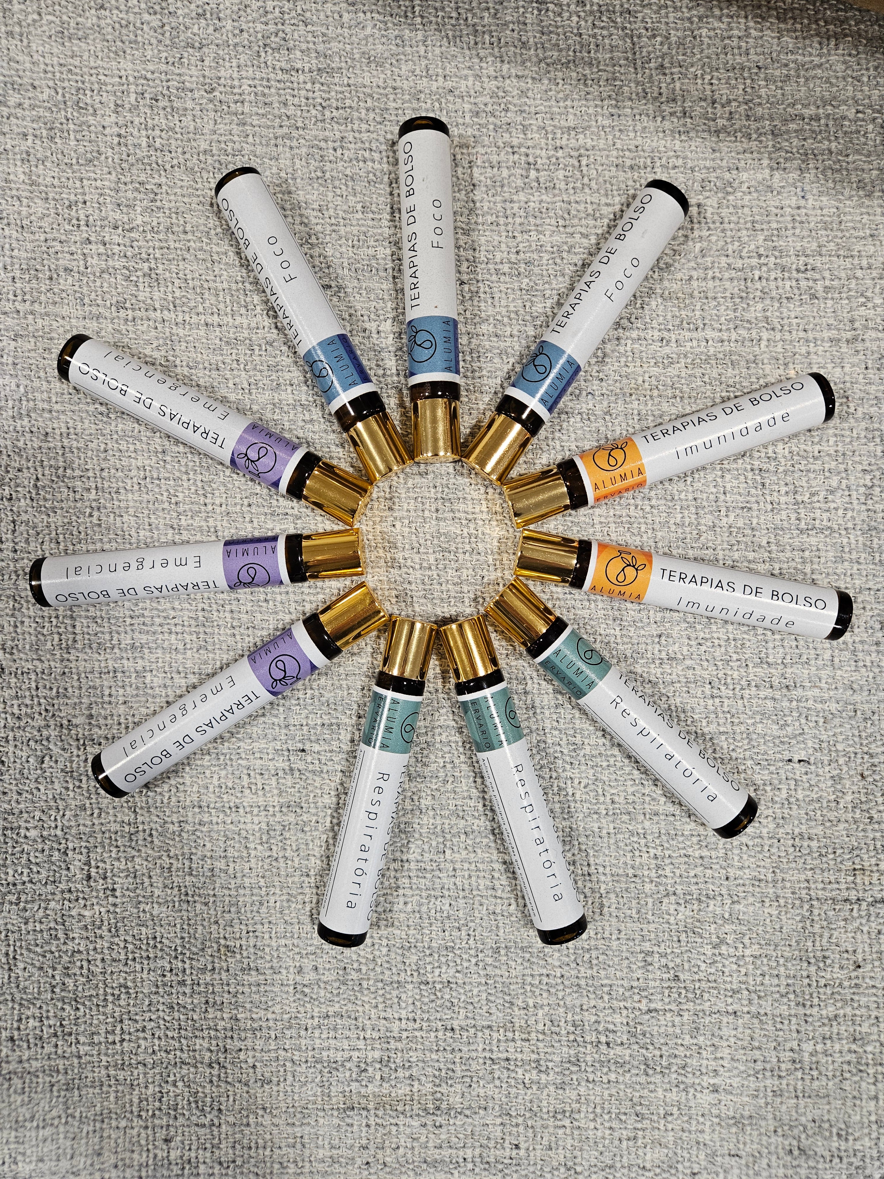 As Terapias de Bolso são sinergias de óleos essenciais em frascos roll-on práticos para levar a qualquer lugar. Combinações potentes que ampliam os benefícios dos óleos, oferecendo bem-estar acessível sem precisar ter cada um dos óleos separadamente. Podem ser aplicadas nos pulsos, têmporas ou pescoço, atuando de forma aromática e tópica. Em 4 versões: foco e concentração, ansiedade e estresse, reforço da imunidade e cuidado respiratório.